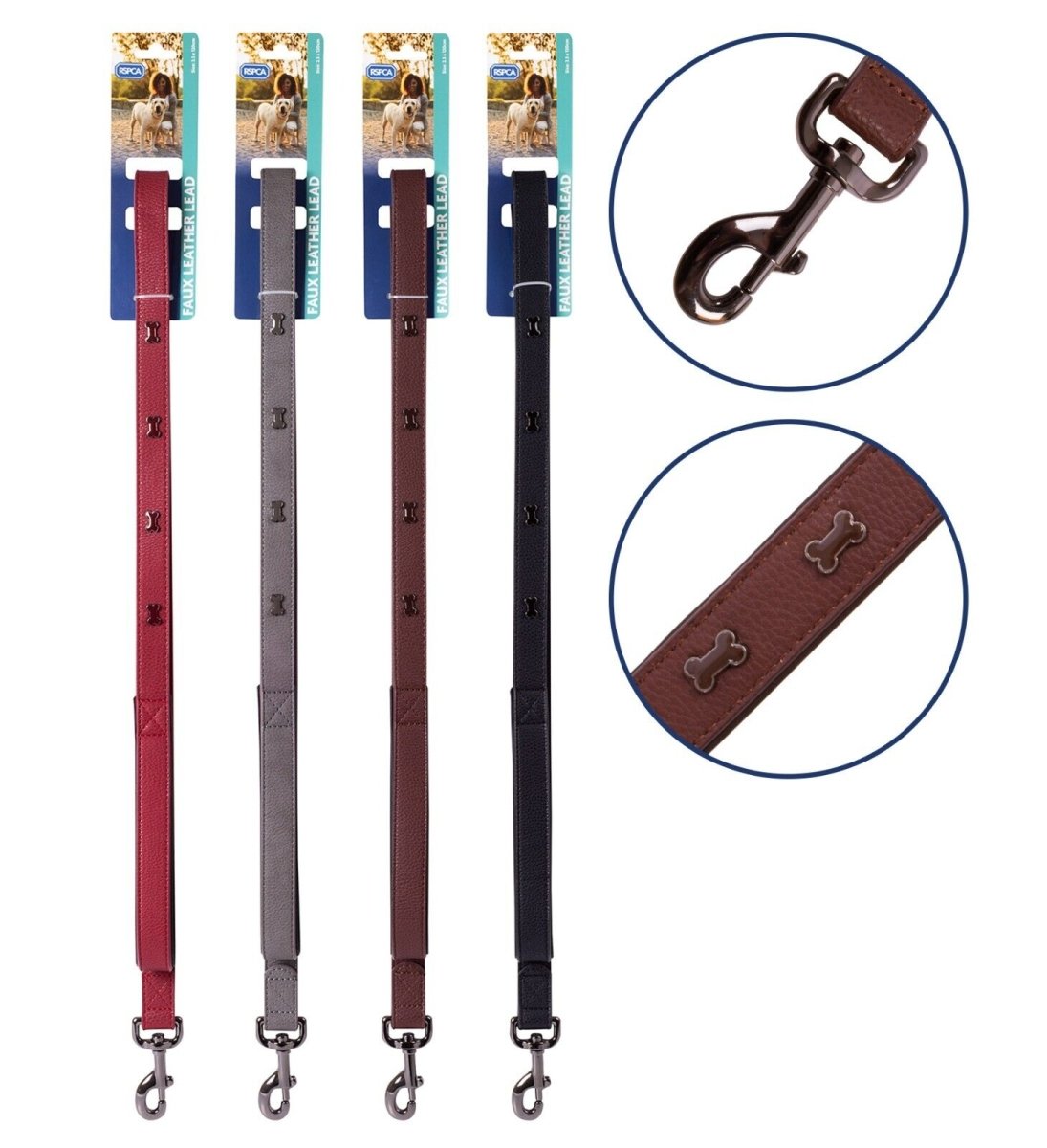 The RSPCA's innovative, robust and stylish range of branded pet accessories includes a variety of embellished leads and collars. This faux leather dog lead with bone embellishments, is an essential item for any pet owner, helping to keep your dog safe and secure whilst out walking.