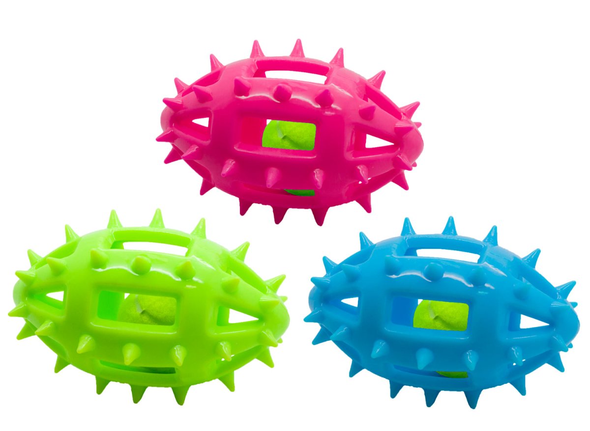 Tuffs Large Spikey Rugby Ball is super durable great for throwing and chewing spikes help clean teeth. The tennis ball centre keeps dogs entertained for longer. Crafted from high-quality materials, this rugby ball is built to last. The spikes add an extra element of oral hygiene, making it a perfect toy for your pup's playtime. Available in a variety of colours, one chosen at random,